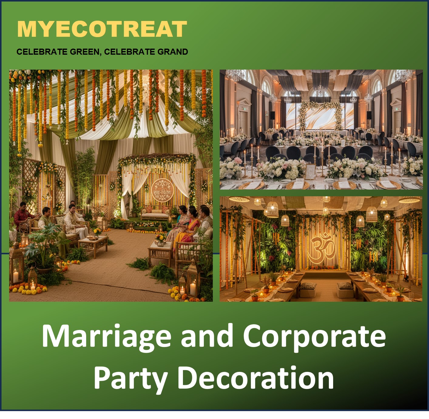 My Eco Treat offers exceptional Marriage and Corporate Party Decoration services under the tagline “Professional Ambiance, Unforgettable Impressions.” We specialize in creating elegant, tailored event decor that complements the unique tone and style of your special occasion or corporate gathering. Our expert team uses eco-friendly materials and innovative designs to bring sophistication and charm to your venue. From stunning wedding mandaps to sleek corporate setups, we ensure every detail reflects professionalism and lasting impact, making your event truly memorable.